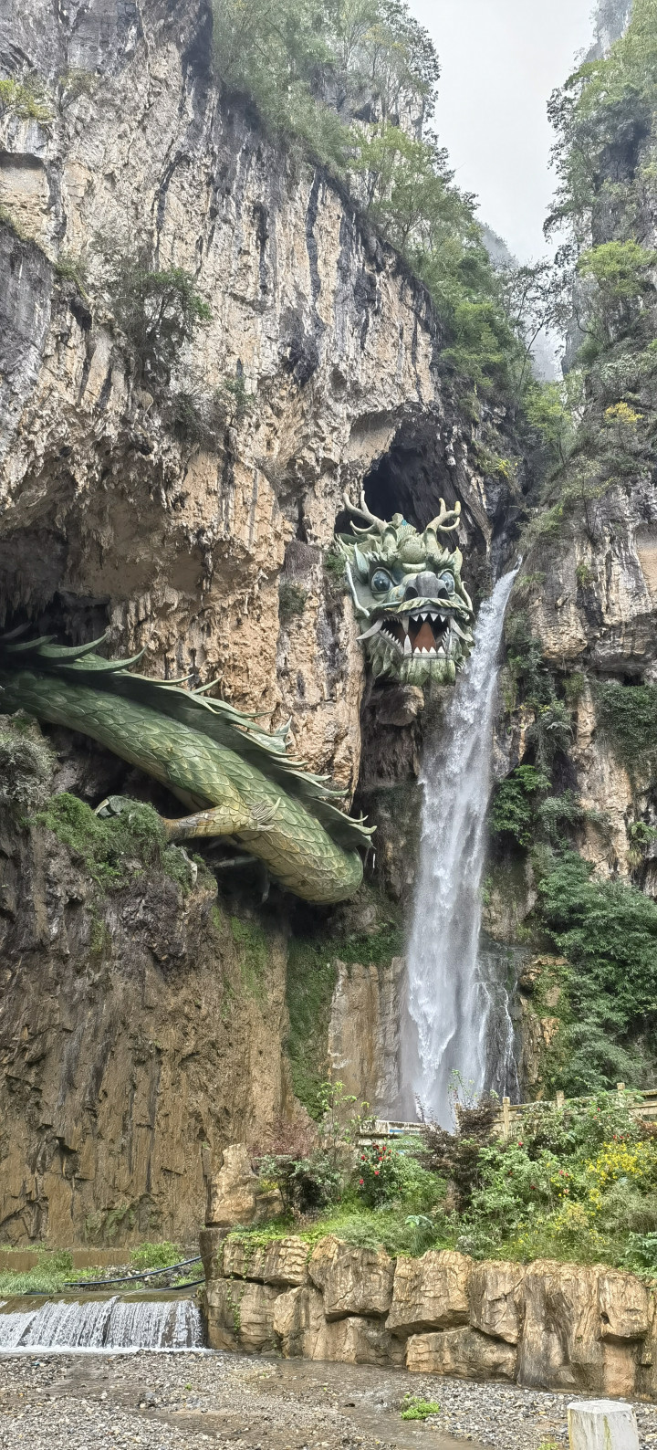 崖壁上一条108米长的青龙从洞中盘绕穿出,